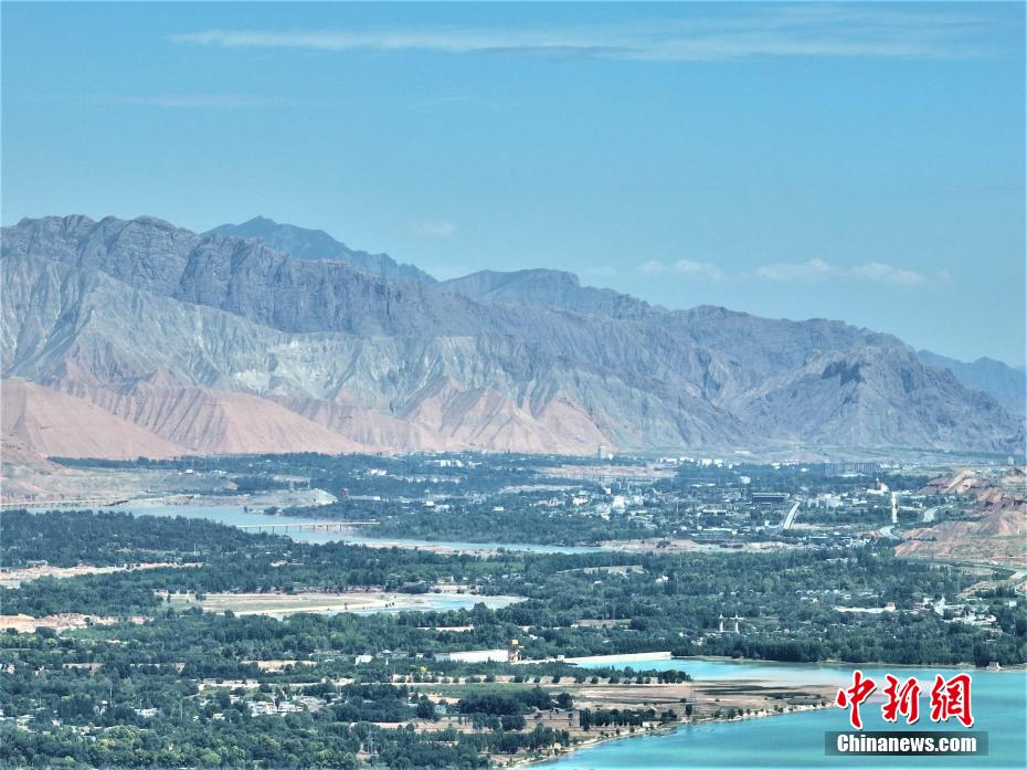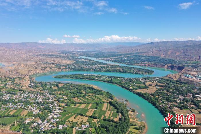8月7日,航拍流经青海省黄南藏族自治州尖扎县境内的黄河美景。地处青藏高原黄河谷地的尖扎县,盛夏时节,黄河岸畔绿意葱茏,河水清澈碧绿,与蓝天白云构成一幅幅夏日田园画卷。