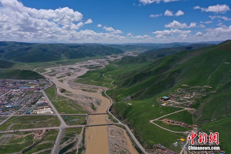 航拍青海省果洛藏族自治州达日县,黄河在群山和城镇中蜿蜒流淌。