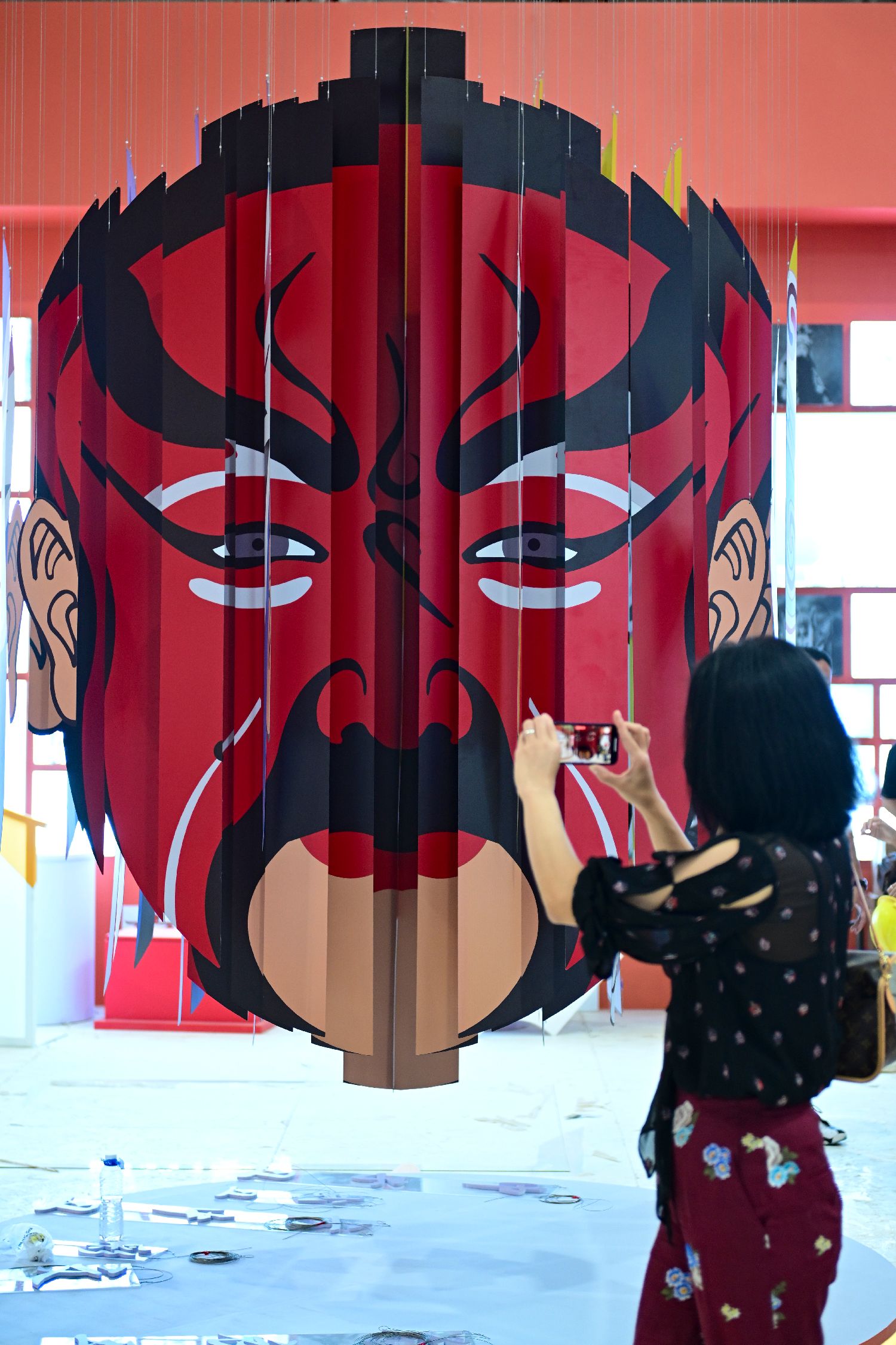 图为媒体记者在位于北京的首钢园展区拍摄京剧脸谱装置。(图片来源:中新社)