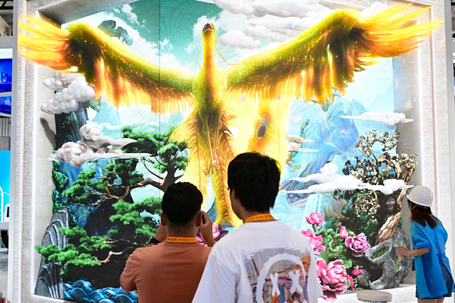 图为媒体记者在位于北京的首钢园展区参观拍摄裸眼三D展示屏。(图片来源:中新社)