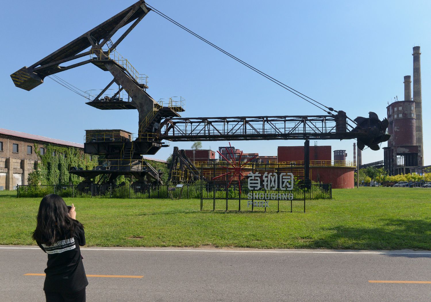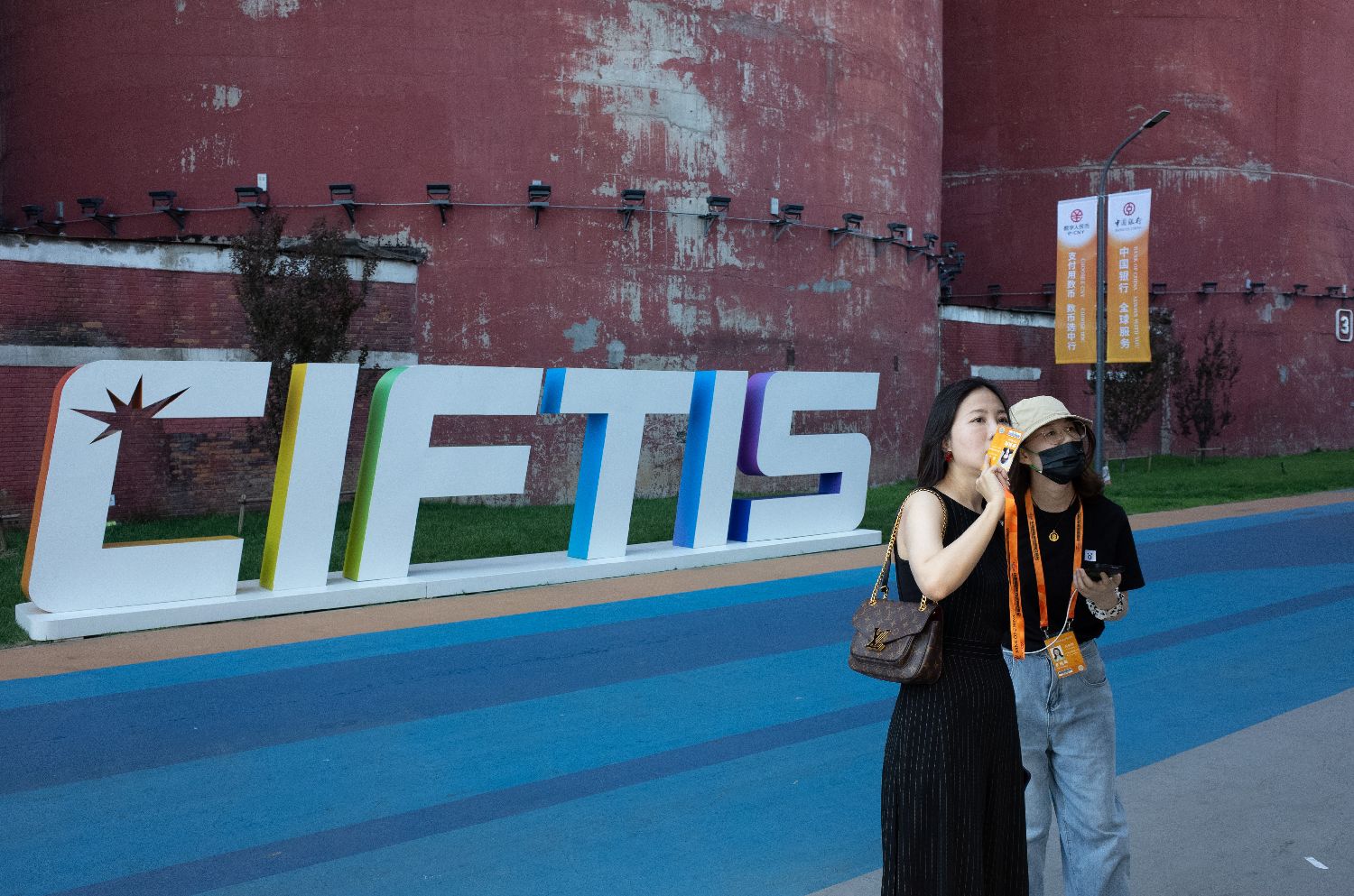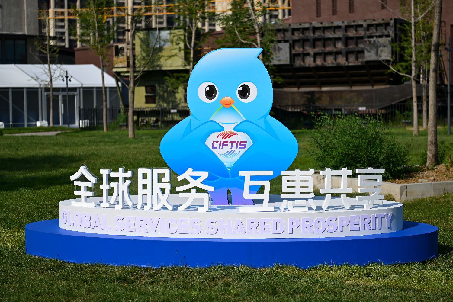 图为位于首钢园展区的一处服贸会标识。(图片来源:中新社)