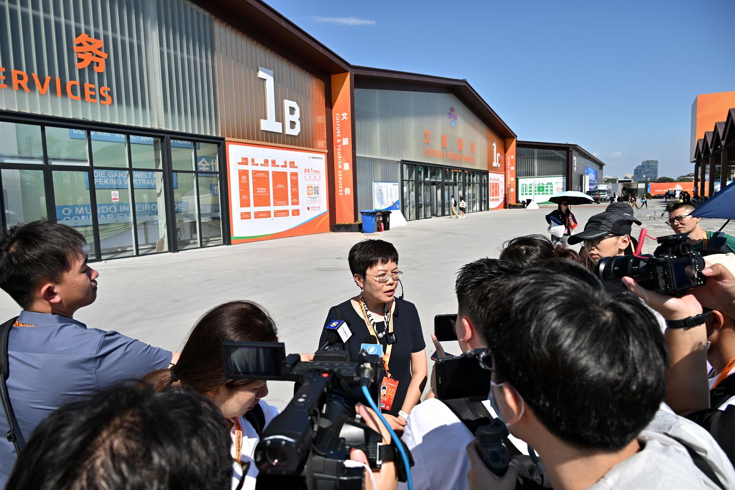 图为工作人员向媒体介绍服贸会首钢园区情况。(图片来源:新华社)