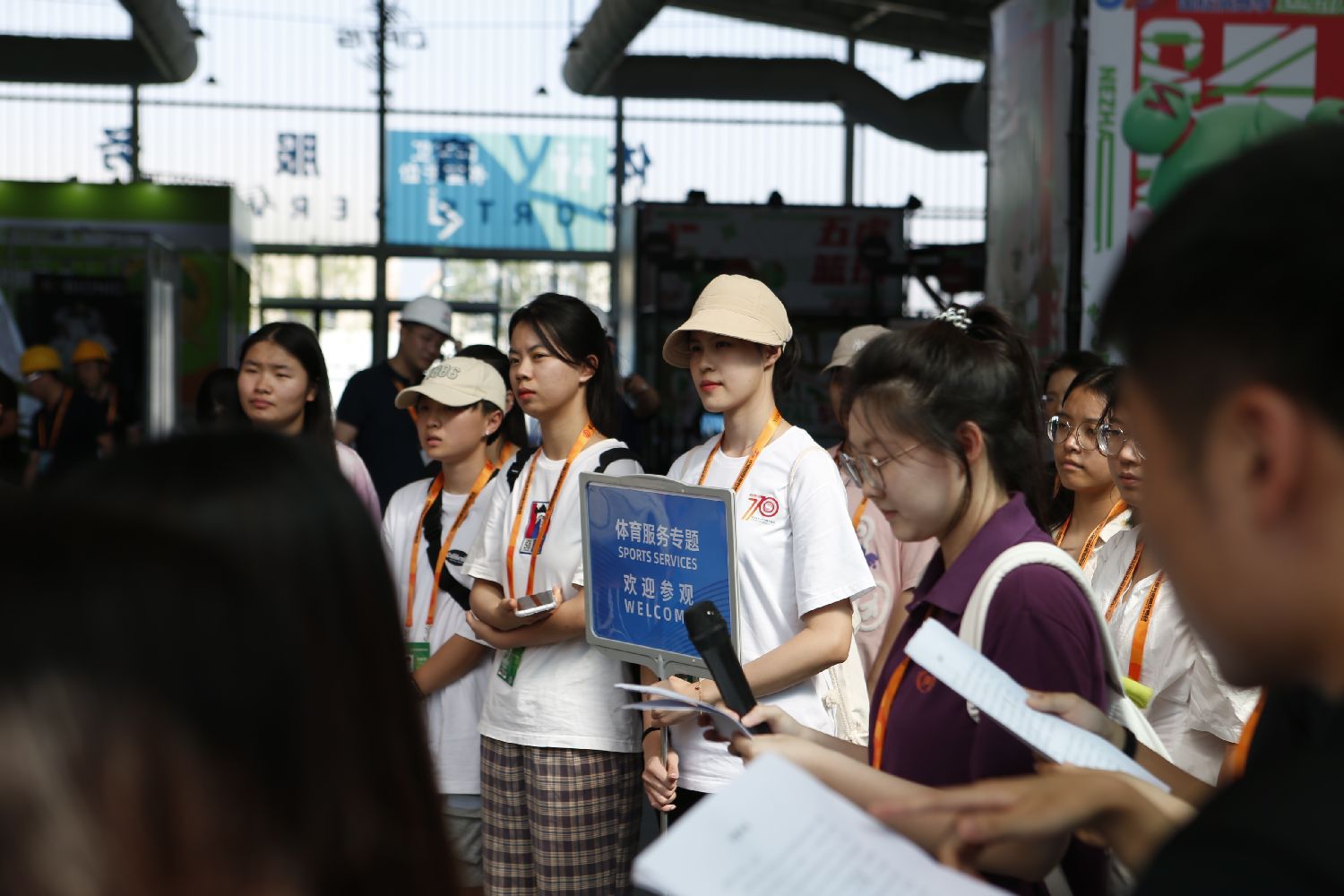 图为在服贸会首钢园区体育服务专题展区内,来自北京体育大学的服贸会志愿者在参加培训。(图片来源:新华社)