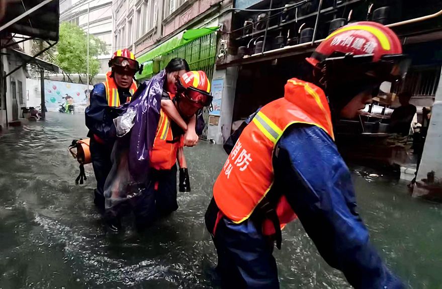 9月4日,受今年第11号台风“海葵”带来的强降雨影响,福建厦门城区多处出现内涝,消防救援人员紧急前往现场转移受困民众。