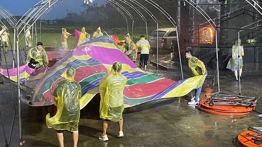 台湾高雄市小港区圣和宫9月3日举行中元普渡,遭遇海葵台风肆虐 帐篷差点被吹翻,庙方工作人员赶紧回收。(图片来源:香港中通社)