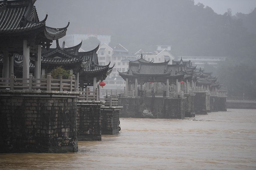 9月5日,受台风“海葵”影响,广东省潮州市广济桥景区暂停开放。强降水使韩江流速超出安全标准,梭船组成的浮桥已拆除。(图片来源:新华社)