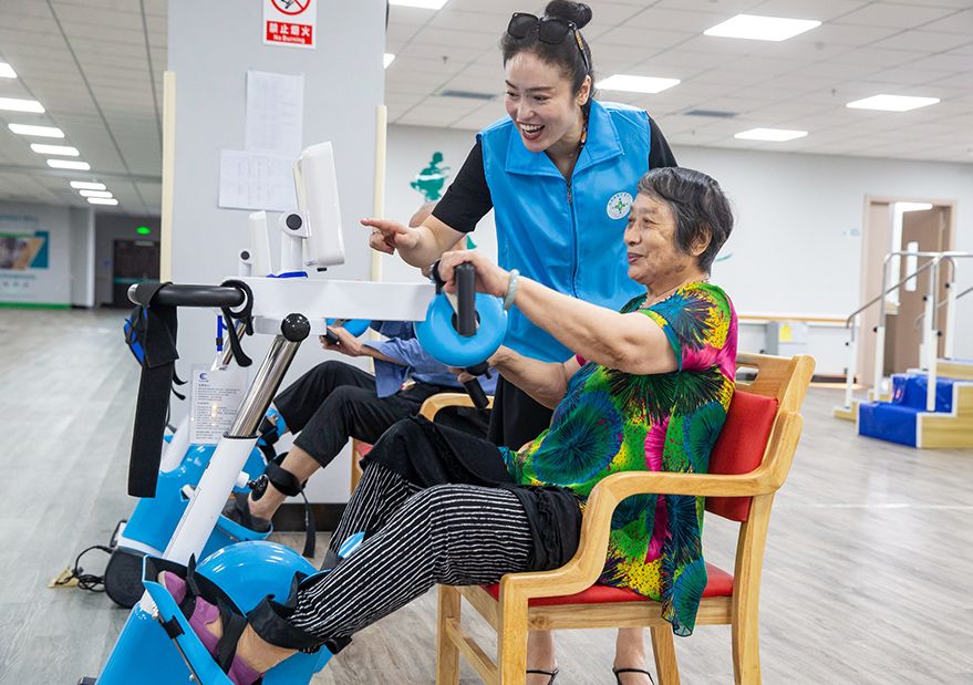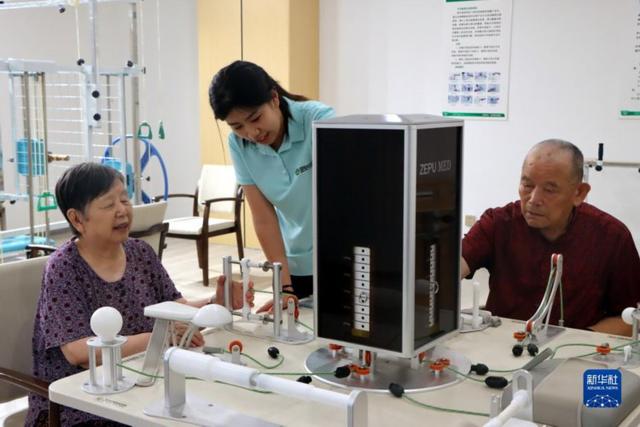 8月22日,江苏省海安市海安街道恒源综合性养老服务中心内,护理人员在指导老人开展康复训练。海安市积极推进“居家社区机构相协调、医养康养相结合”的养老服务体系建设,着力构建“出门有去处、娱乐有场所、需求有供应、在家有服务”的“四有”居家和社区养老服务。(图片来源:中新社)