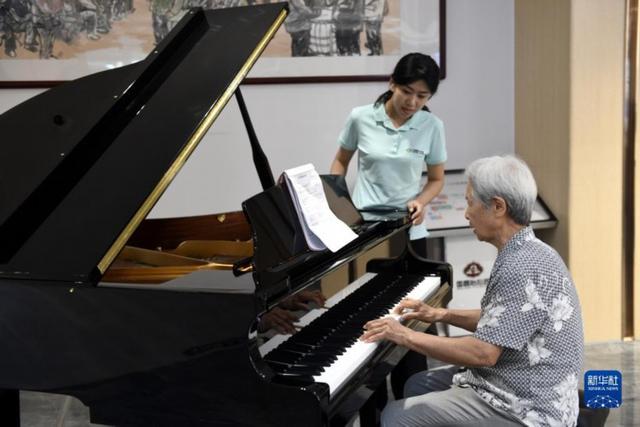 8月21日,90岁的邵琦老人(右)在山东省滨州市沾化区大高镇国昌怡心园内演奏钢琴。(图片来源:新华社)