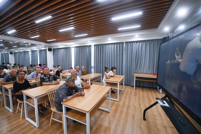 8月23日,在浙江省湖州市吴兴区东林镇东华村居家养老服务中心的影音室,老人们在观看影片。(图片来源:新华社)