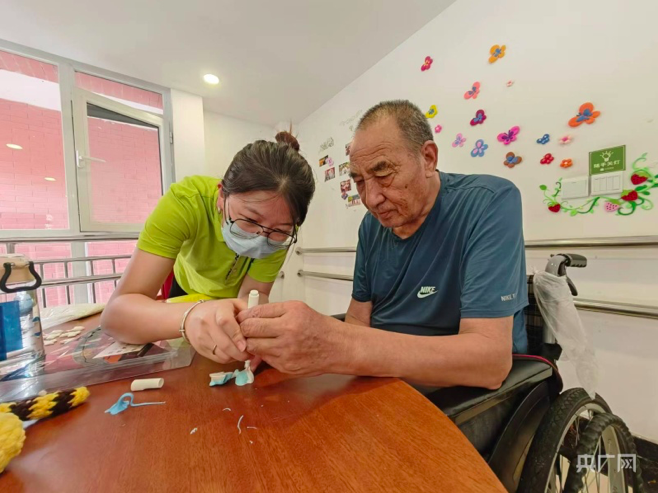 近日,山东济南养老服务中心,老人参加手工制作进行康复锻炼。(图片来源:北京央广网)
