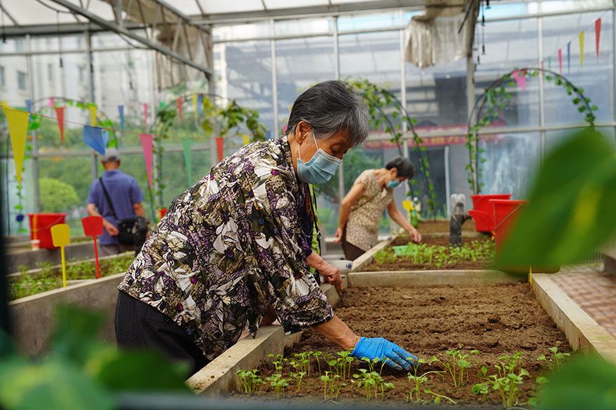 9月4日,河北廊坊三河市燕达金色年华健康养护中心,入住老人在阳光种植房内打理自己种植的蔬菜。近年来,河北廊坊以环京周边县市为重点区域,加快推动医养康养项目建设,积极承接京津养老功能疏解,“跨城养老”成为流行趋势。(图片来源:中新社)