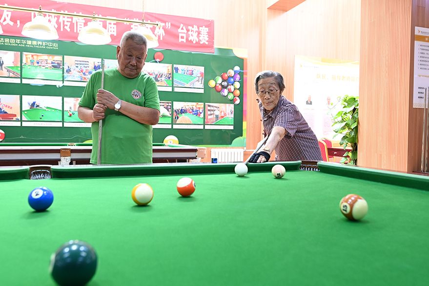 9月4日,河北廊坊三河市燕达金色年华健康养护中心,入住老人在娱乐室打台球。在河北廊坊三河市燕达金色年华健康养护中心,已有5000余名老人入住,其中95%的老人来自北京。 (图片来源:中新社)