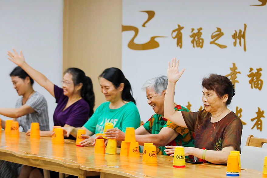 8月24日,福建省福州市鼓楼区安泰街道幸福邻里中心,老年人体验竞速叠杯活动乐趣。鼓楼区全面推进“一刻钟幸福圈”建设,落实推出数字养老、税费减免、志愿服务等措施,依托幸福邻里中心汇聚老年大学授课、长者食堂就餐、医疗康养服务等养老服务场景,让社区老人足不出“圈”就能享受幸福生活。(图片来源:中新社)