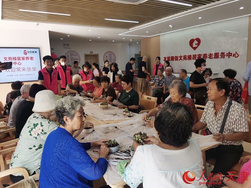 9月4日,天津市河西区友谊路街文苑楼居家养老服务中心正式开业投入运营。文苑楼居家养老服务中心开办首场学习班,现场教授老年人种植多肉植物。(图片来源:人民网)