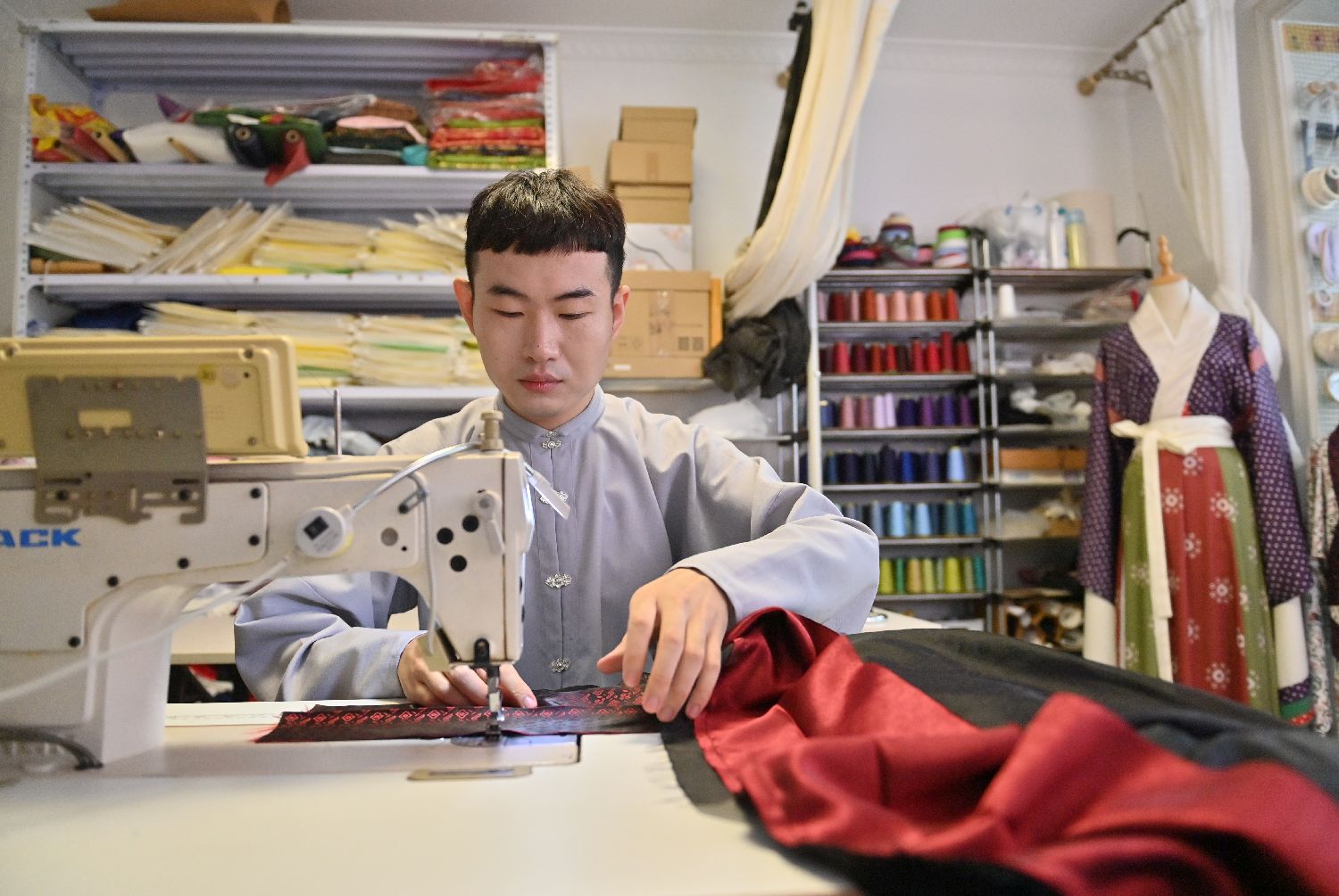 9月11日,尹航在工作室制作汉服。(图片来源:中新社)