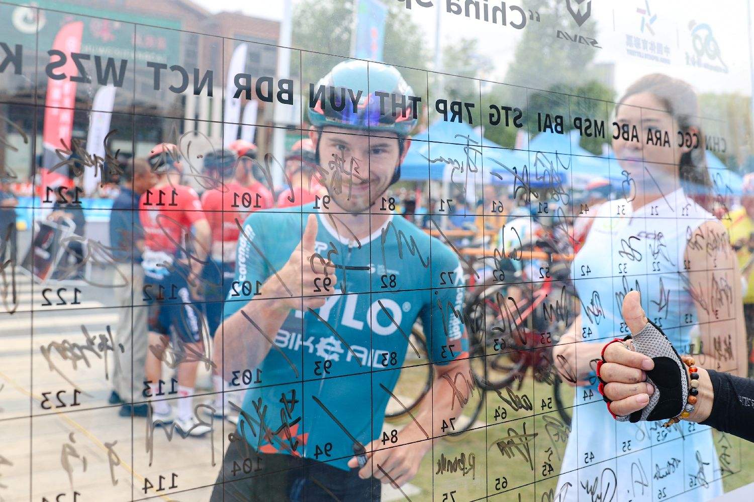 本站赛事是本届环鄱赛十一站比赛中,属于国际自行车联盟亚洲巡回赛(2.2级)赛段的最后一站比赛。图为比赛开始前,来自德国助力车队的一位选手在签名板前竖起大拇指为自己加油。(图片来源:中新社)