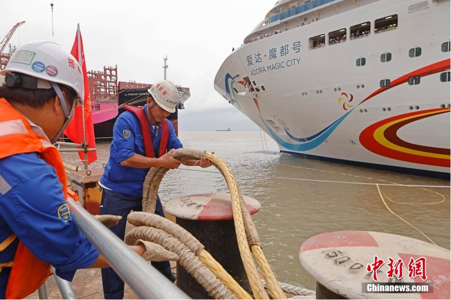 工作人员在码头上为中国首制大型邮轮“爱达·魔都号”固定缆绳。(图片来源:中新网)
