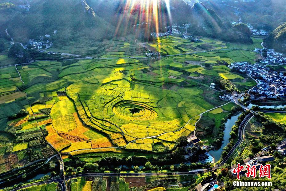 金秋时节,贵州省黔东南苗族侗族自治州从江县秀塘壮族乡梯田水稻陆续成熟,金灿灿的层层稻田与民居、公路、山峦等相映成景,构成一幅幅迷人的和美乡村田园画卷。