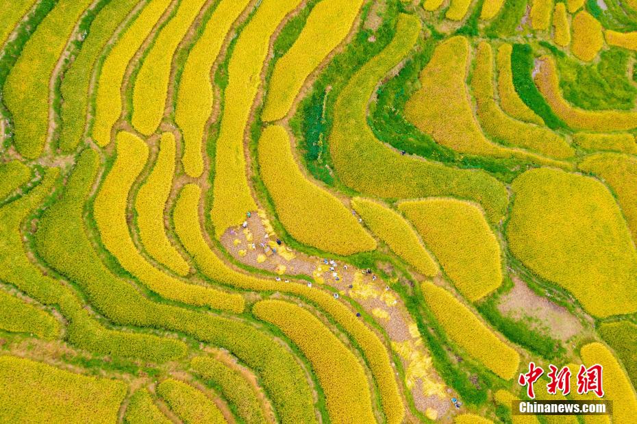 连日来,湖南省永州市东安舜皇山国家森林公园管理局塘家梯田,村民们开镰收割。层层叠叠的梯田与劳作的村民们构成了一幅秋收“丰”景,吸引了众多游客与摄影爱好者采风打卡。