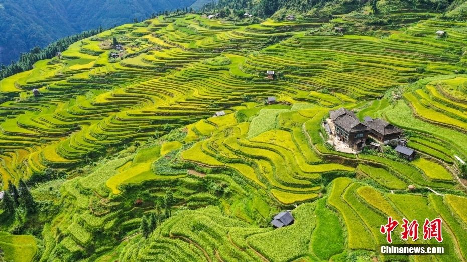 初秋时节,贵州省黔东南苗族侗族自治州从江县加榜梯田里的水稻开始泛黄,呈现出一派丰收在望的景象。