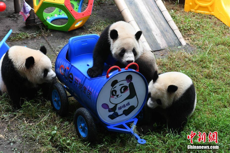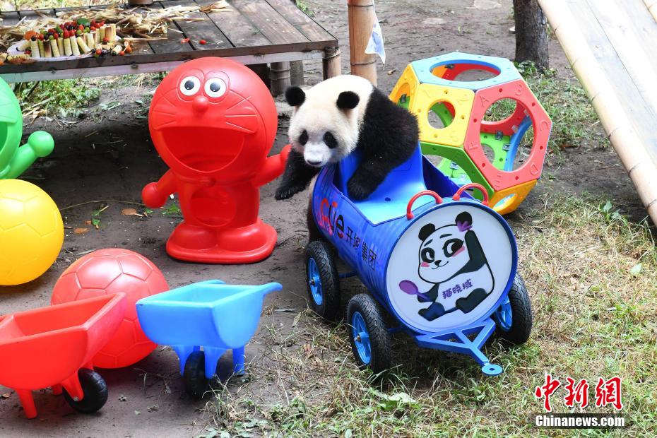 图为生日会现场,大熊猫对生日礼物充满好奇。(图片来源:中新网)