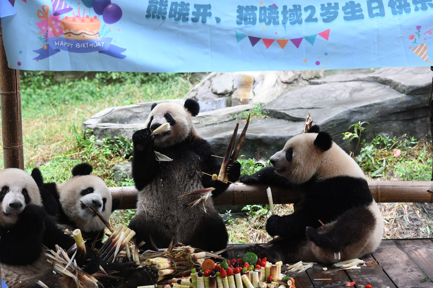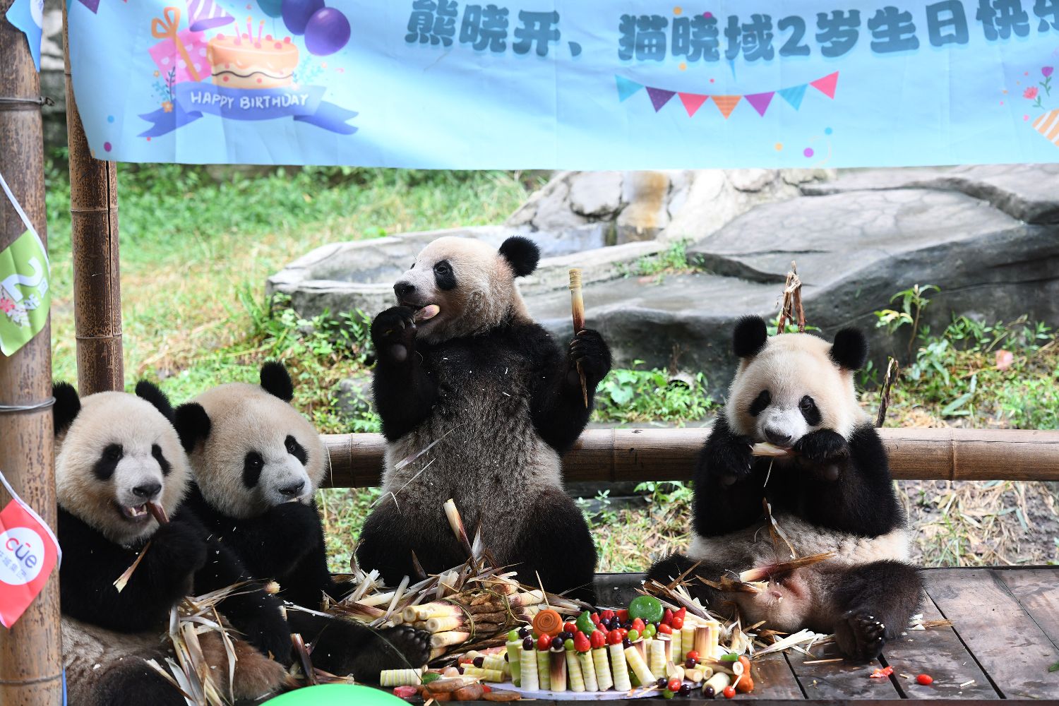 9月13日,重庆动物园为大熊猫举办生日会,庆祝“熊晓开”“猫晓域”两周岁生日。当日,饲养员们精心准备了竹笋、苹果、葡萄、胡萝卜、番茄等食材制作的生日蛋糕供它们享用。而同一笼舍的大熊猫“星星”“辰辰”也一起品尝生日蛋糕,为“熊晓开”“猫晓域”庆祝两周岁生日。