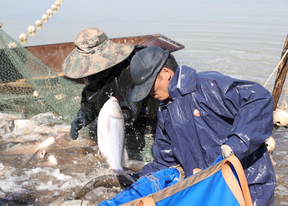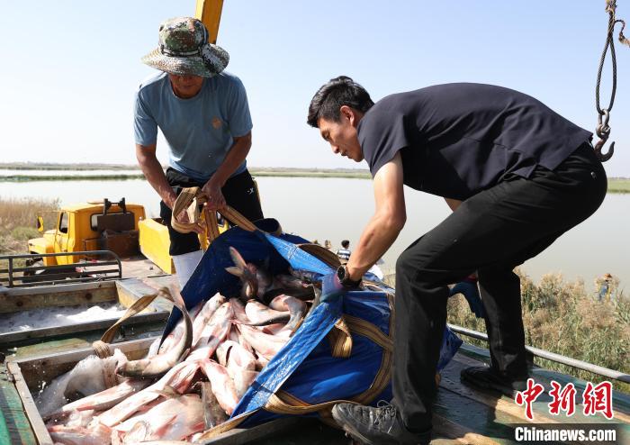 宁夏农垦集团前进农场,工作人员正在将捕捞的鱼进行装车。(图片来源:中新网)