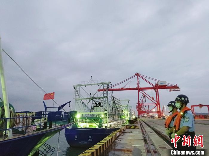 近日,在福建平潭金井码头,一艘艘刚刚刷过油漆、桅杆高处五星红旗迎风飘扬的崭新渔船,劈波斩浪,驶向大海,开展为期1年的捕鱼作业。这是平潭口岸首批远洋渔船出境。(图片来源:中新网)