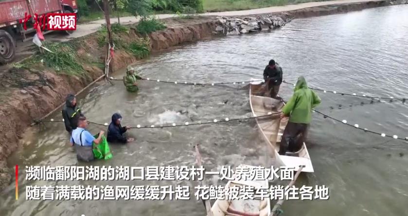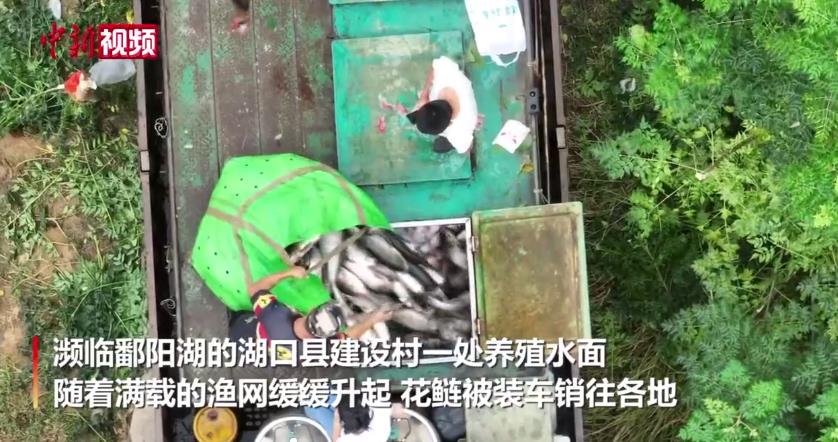 近日,江西湖口县一处养殖水面,随着满载的渔网缓缓升起,网箱里的鱼聚拢在一起,活蹦乱跳、水花飞溅。肥硕的花鲢被分拣到巨大的网兜里,再吊装进专用运输车,销往各地。(图片来源:中新视频截图)
