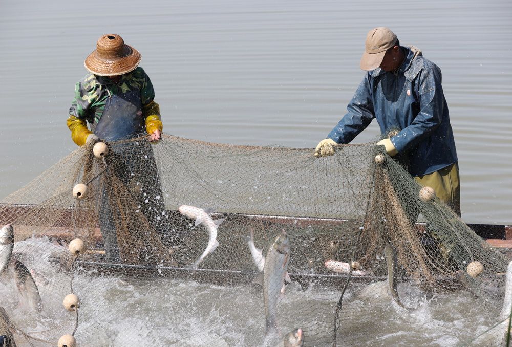 9月13日,宁夏农垦集团前进农场,工作人员在湖面捕鱼。随着秋季到来,宁夏农垦集团前进农场生态鱼塘里的鲤鱼、鲢鱼等鱼种进入收获季节。(图片来源:中新社)