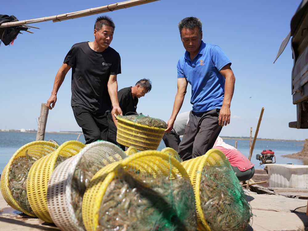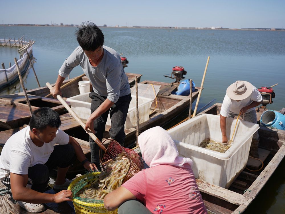 海兴县地处渤海之滨,土地盐碱化严重,种植效益差。近年来,当地依托盐碱滩涂搞起了特色水产规模化养殖,打造“蓝色粮仓”,目前已成为海兴县主导产业之一。图为9月13日,养殖户在河北省沧州市海兴县小山乡蔡家庄村养殖虾池收获对虾。(图片来源:新华社)