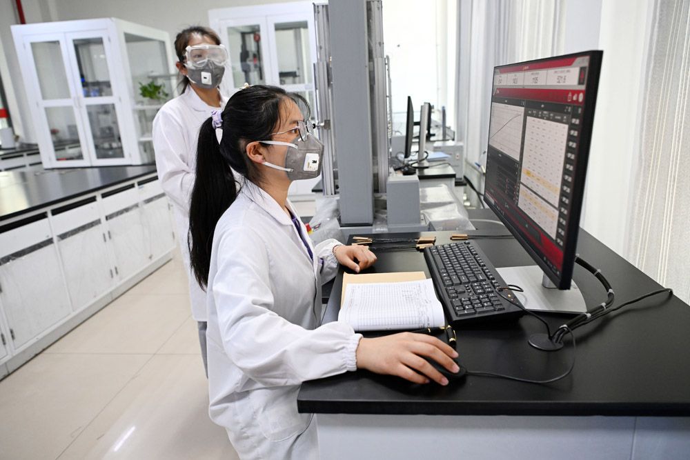 在中国建材集团西宁万吨碳纤维生产基地实验室内,工作人员对碳纤维拉力进行测试。
