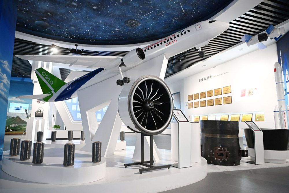 中国建材集团西宁万吨碳纤维生产基地展厅内展示的碳纤维在航空领域的应用。