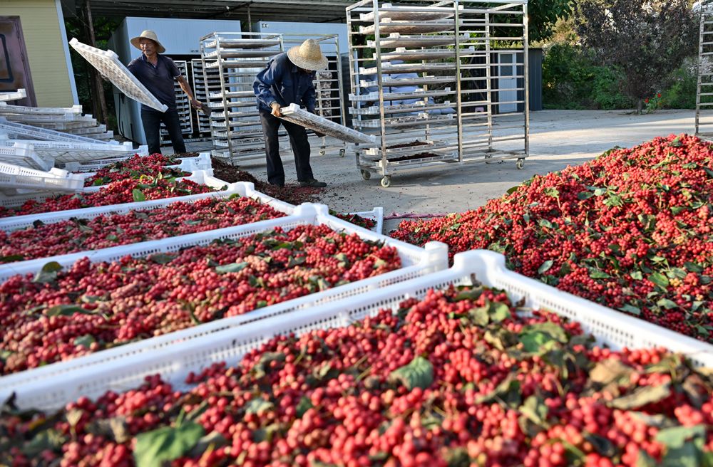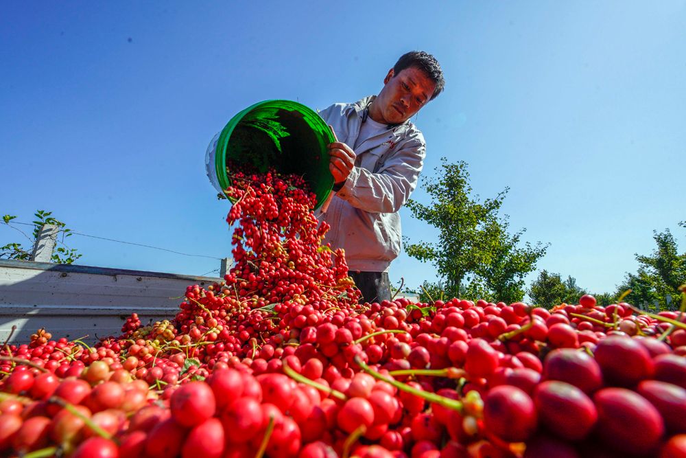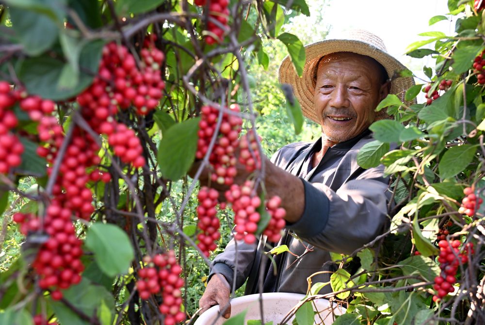 9月18日,唐山市丰润区火石营镇东高庄村的农民采摘五味子。近年来,河北省唐山市丰润区引导地处丘陵、山区地带的农民因地制宜发展五味子、苍术、黄芩、酸枣、柴胡等中药材种植,促进农民增收,助力乡村振兴。(图片来源:本文图片均综编自新华社)