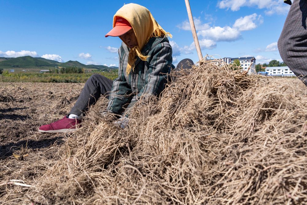 9月19日,在黑龙江勃利县一中草药种植基地,当地农民对刚收获的白薇进行初步清理。
