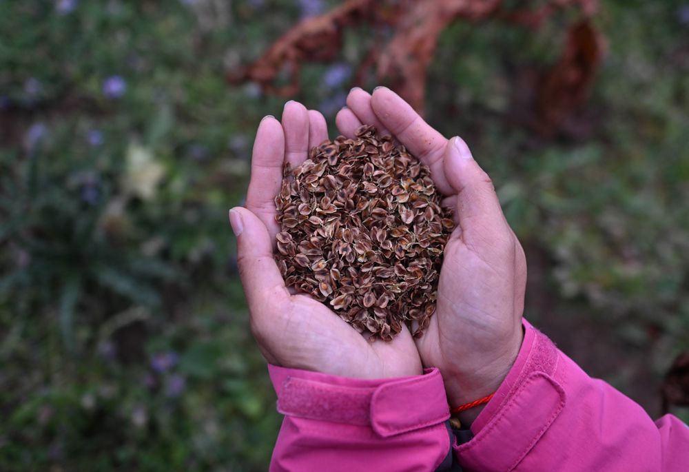 9月5日,中国科学院西北高原生物研究所科研人员在果洛藏族自治州甘德县岗龙乡一处“草药间种”的黑土滩治理试验田展示当地道地药材唐古特大黄的种子。近年来,青海省果洛藏族自治州通过筛选当地道地药材和优良牧草,进行药材和牧草的合理间作模式,助力黑土滩治理,有效遏制草原退化。