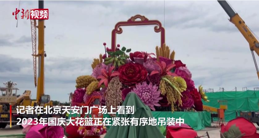 国庆节即将来临,9月19日,在北京天安门广场上,2023年国庆大花篮正在紧张有序地吊装中,目前已初具雏形。不少市民游客在花篮前拍照留念。(图片来源:中新视频截图)
