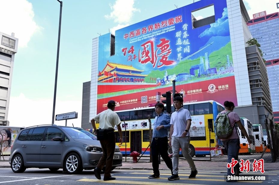 香港街头19日有建筑物出现庆国庆的巨幅海报或横幅,气氛浓厚。图为香港上环一建筑物外墙贴有巨型庆国庆海报。(图片来源:中新网)