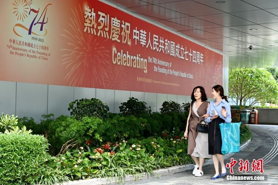 香港特区政府总部的外墙贴上大型横幅庆国庆。香港特区行政长官李家超19日在出席行政会议前会见媒体时表示,特区政府和公营机构将推出一系列活动和优惠,同市民共同庆祝中华人民共和国成立74周年。(图片来源:中新网)