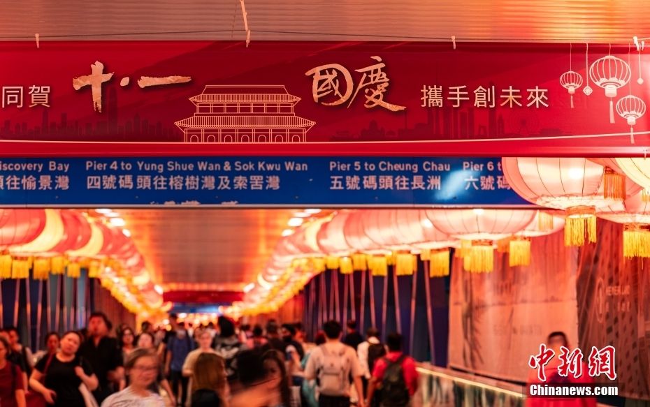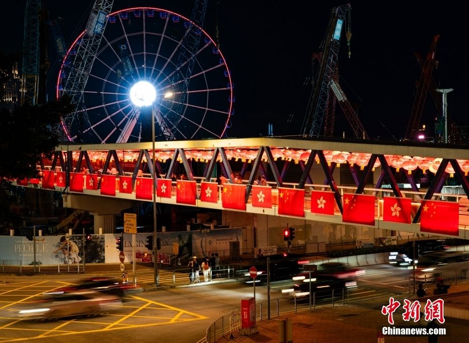 李家超介绍,10月1日当晚会复办国庆烟花活动,这是5年来国庆烟花再次在维多利亚港绽放。此外,鉴于特区政府在7月1日香港回归纪念日当天带头推出的活动得到各界支持,也收到市民和游客的正面反应,国庆期间将再次推出一系列活动和优惠措施。图为9月19日,香港特别行政区中环天桥悬挂中国国旗和特区区旗,并布置有喜庆的红灯笼等饰物,准备迎接中华人民共和国成立七十四周年。(图片来源:中新网)