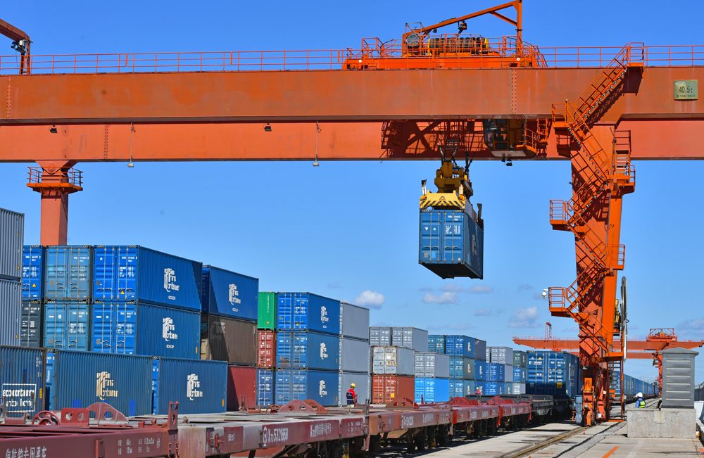 目前,从天津港开行的中欧(中亚)班列线路可通达多个亚欧国家,极大畅通了天津港及京津冀地区的国际物流通道。图为9月18日,在天津港物捷三堆场,一列发往蒙古国乌兰巴托的中欧(中亚)班列进行集装箱吊装作业。