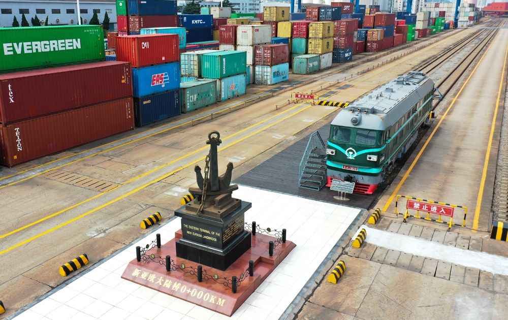 集装箱堆场22万平方米、铁路专用线3.8公里、年最大装卸能力41万标箱——如今的中哈连云港物流合作基地已成为中亚国家过境运输、仓储物流、往来贸易的重要平台。图为9月16日拍摄的新亚欧大陆桥东端起点标志。