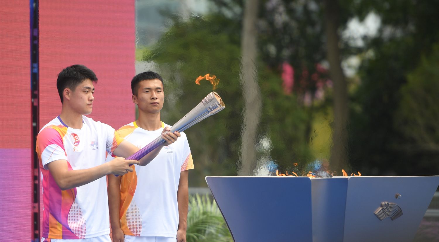9月20日,在浙江杭州,最后一棒火炬手吴易昺点燃火种盆。(图片来源:中新社)