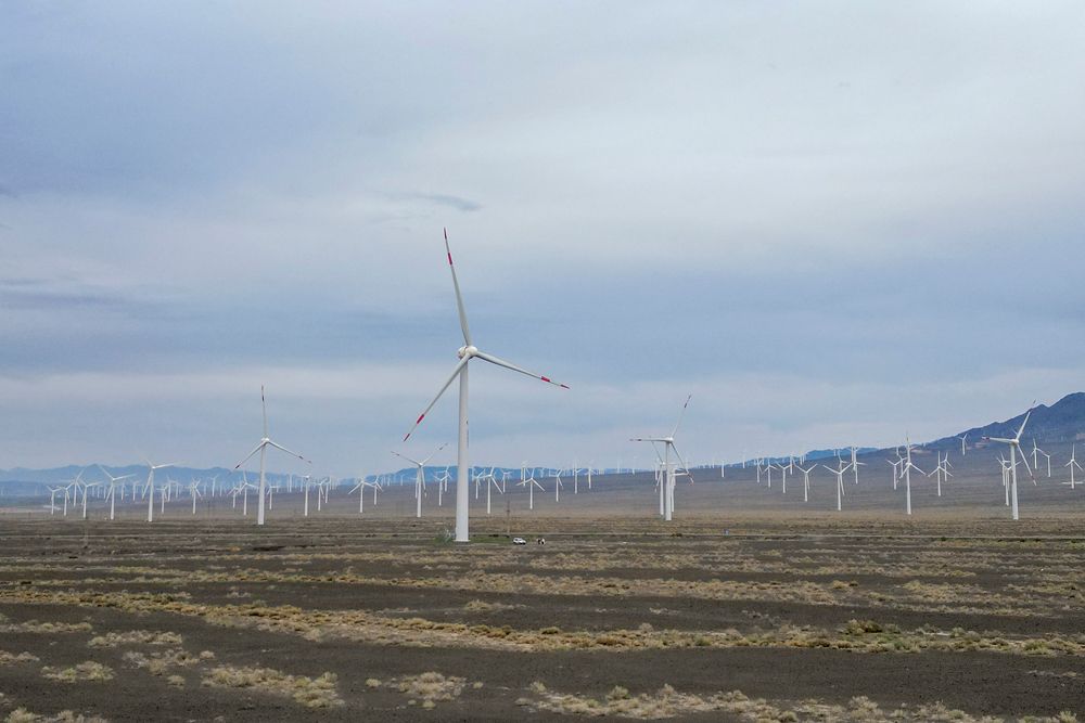 新疆达坂城风电场被誉为“中国风电摇篮”。来自吐鲁番盆地和准噶尔盆地的季风,在峡谷两侧高耸的天山山脉“挤压”下,形成类似穿堂风的“狭管效应”,造就了达坂城年250亿千瓦时的风能蕴藏。图为新疆达坂城风电场。