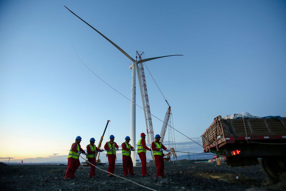 作为世界最大风力发电企业,国家能源集团1994年建成投产的新疆达坂城风电场,拉开中国商业化运营风电场的序幕。8月4日,国家能源集团龙源电力新疆达坂城风电场“以大代小”技改增容扩建项目吊装工作正式启动。图为在新疆达坂城风电场,施工人员对一台风力发电机组进行吊装作业。