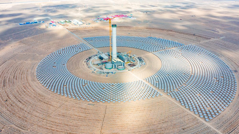 9月19日,中铁十一局承建的阿克塞汇东新能源光热+光伏试点项目吸热塔顺利结顶,为后续并网发电奠定了基础。该项目位于甘肃省酒泉市阿克塞哈萨克族自治县四十里戈壁,项目建成后,预计可实现年均上网电量17亿千瓦时。图为当日拍摄的试点项目吸热塔及镜场区。