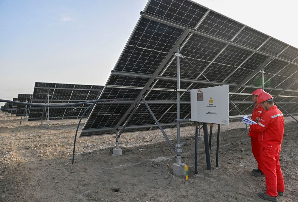 今年,中国石油塔里木油田加快推进新能源基地建设,充分利用新疆南部地区太阳能资源禀赋好、“沙戈荒”土地富余等自然条件,加快光伏等新能源项目建设。图为9月18日,工作人员在进行日常巡检。