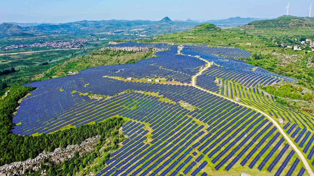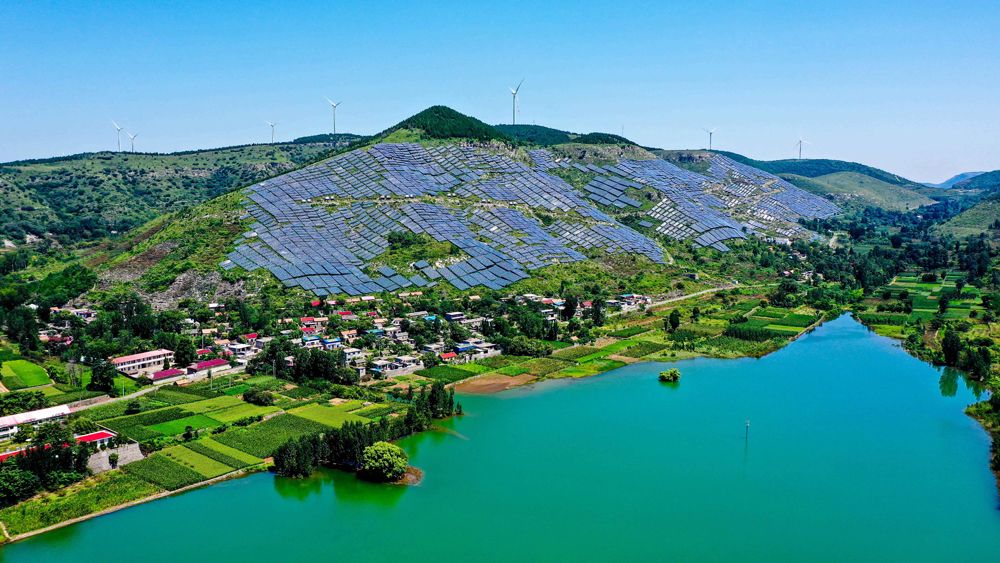 山东省枣庄市山亭区近年来利用丰富的山地、丘陵地形和光照资源优势,大力发展光伏发电、风力发电等清洁能源。截至目前,山亭区已建成风力发电项目1个、光伏发电项目7个,新能源发电量占全市的25.8%,为县域经济绿色低碳发展注入了清洁动能。图为8月10日拍摄的山东省枣庄市山亭区水泉镇光伏发电基地。