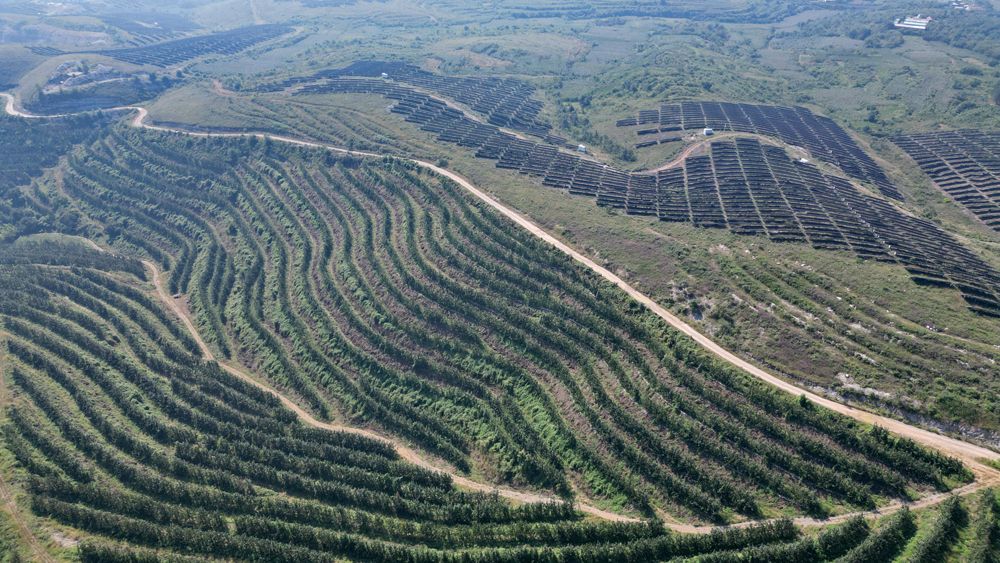 9月15日拍摄的河北省玉田县唐自头镇一处经荒山开发而建的果园和光伏发电场。河北省玉田县近年来将荒山综合开发作为推动乡村振兴的着力点和突破点,通过建设林果种植基地、光伏发电场等,在山区和丘陵地带综合利用荒山4万余亩,带动当地近万名山区农民实现增收。