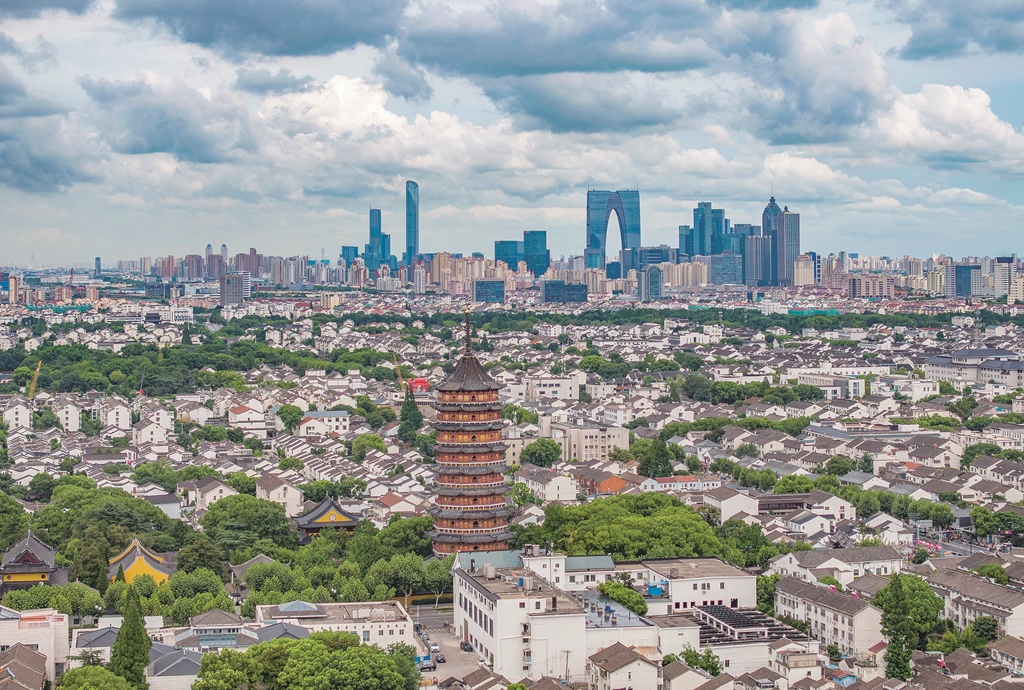 7月27日,江苏苏州,古城与现代化新城区相映生辉。苏州城始建于公元前514年,距今已2500多年历史。(图片来源:中新社)